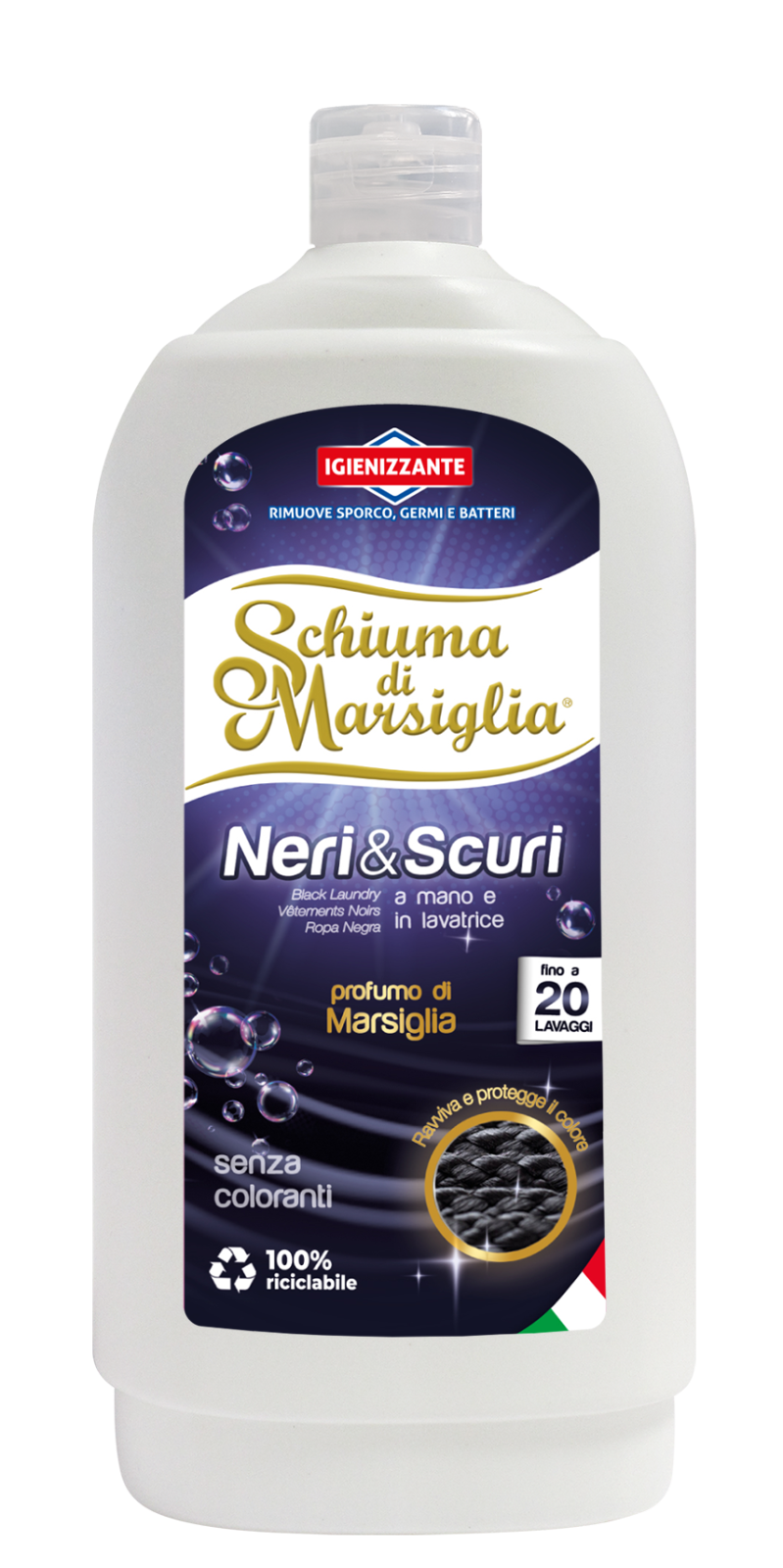 Schiuma di Marsiglia Neri & Scuri este un detergent lichid de calitate superioara, ideal pentru haine negre si textile delicate, eficient atat la spalarea manuala, cat si in masina de spalat.